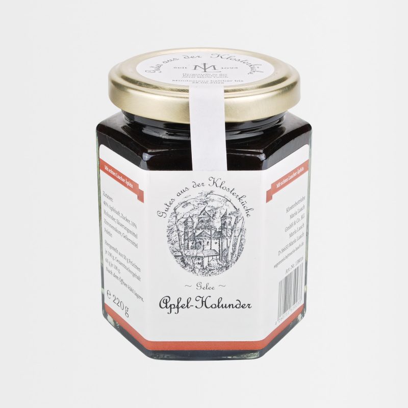 40% Apfelsaft, Zucker, 10% Holunder, Säuerungsmittel Zitronensäure, Geliermittel Pektin
