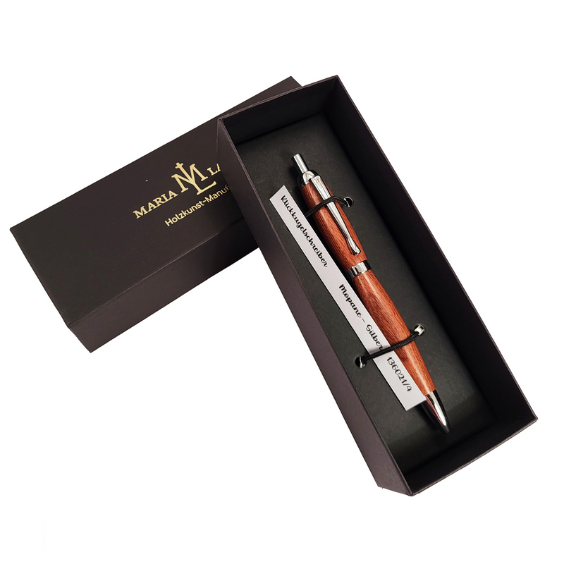 Exklusiver Holzkugelschreiber mit Stil: Unsere handgefertigten Klickkugelschreiber vereinen edle Holzarten mit metallischen Akzenten in Gold, Silber oder Titanium. Die klare Linienführung und der präzise Druckmechanismus verbinden Funktionalität mit ästhetischem Anspruch. Ideal für Büro, Reise oder Alltag – der angenehme Druckpunkt, die ausgewogene Gewichtsverteilung und die natürliche Wärme des Holzes machen jedes Schreiben zu einem besonderen Erlebnis. Ein luxuriöser Kugelschreiber für alle, die Wert auf Stil, Qualität und Alltagstauglichkeit legen. Geliefert in einer hochwertigen Geschenkverpackung – das perfekte Geschenk für Schreibliebhaber und Genießer.